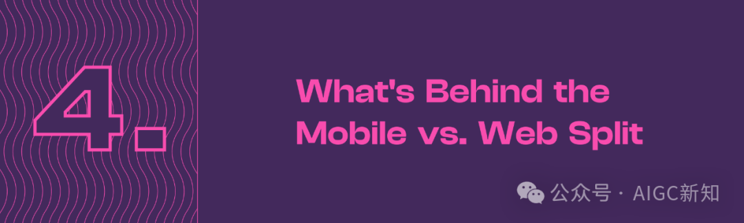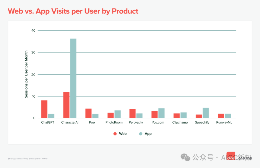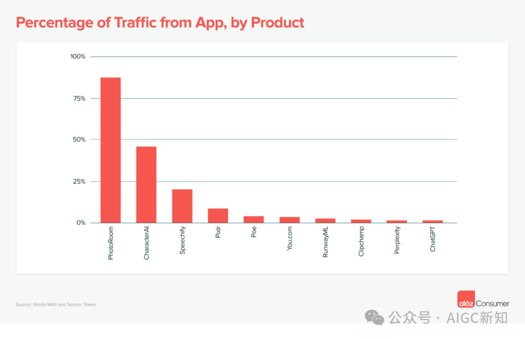 例外:专业消费者设计工作室 PhotoRoom(估计占应用流量的 88%)、配套应用 CharacterAI(占应用流量的 46%)和文本转语音产品 Speechify(占应用流量的 20%)。