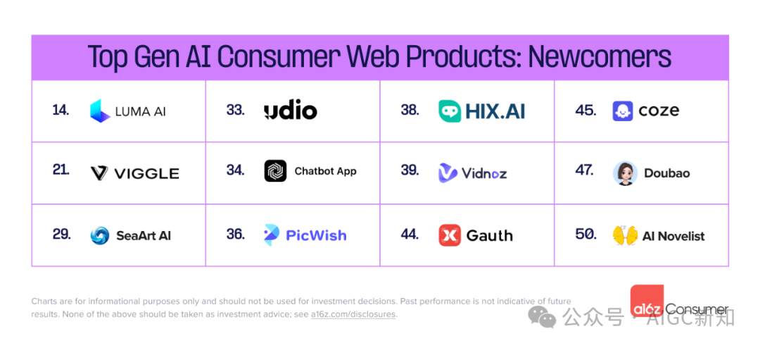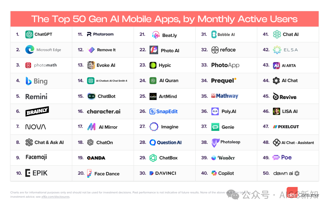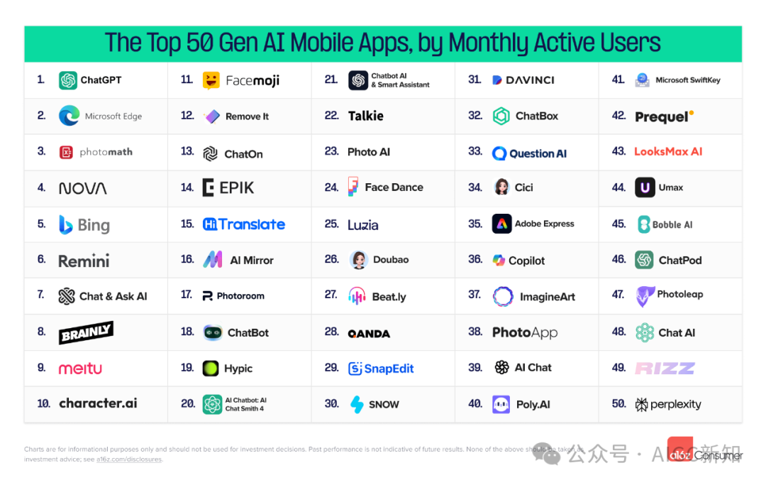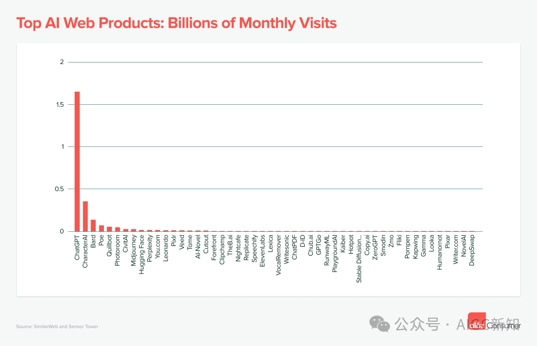 每六个月,a16z都会对数据进行更深入的研究,对前 50 名 AI 优先的 Web 产品(每个月独立访问量)和前 50 名 AI 优先的移动应用程序(月活用户)进行排名。
