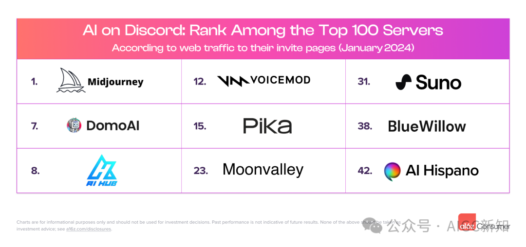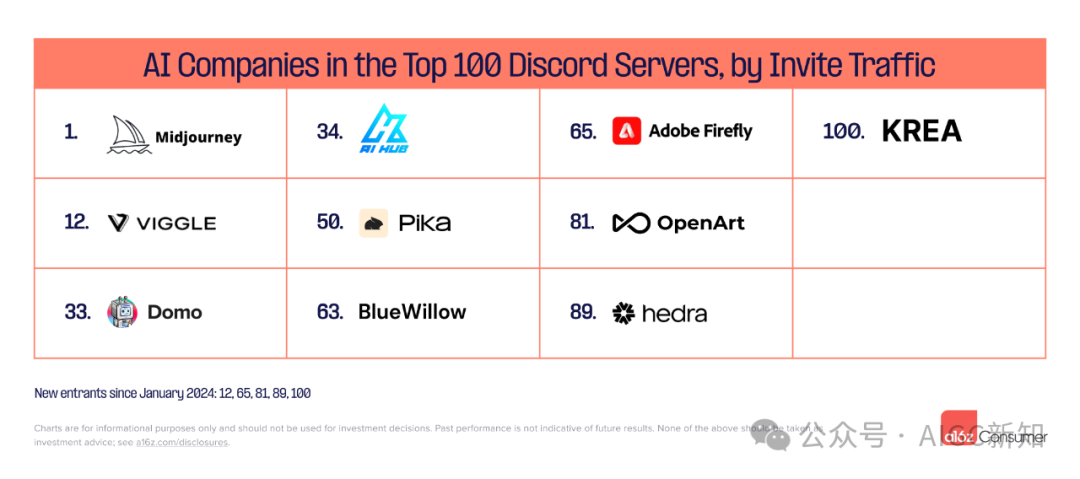 截至 7 月,有 10 家 AI 公司按邀请流量在所有 Discord 服务器中排名前 100。与 1 月份相比,其中一半是新进入者: