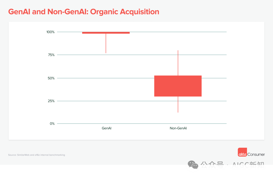 列表中的大部分公司都没有付费营销,通过 X、Reddit、Discord 和电子邮件以及口碑和推荐增长,有大量的免费流量。这些 GenAI 产品的底部四分之一的流量只有 2% 来自付费来源。