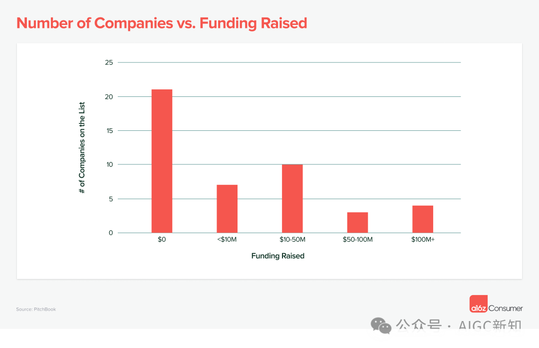 一个现象:用相对较少的资金就能快速推出大型 AI 产品,有 15% 的 AI 产品已经筹集了超过 5000 万美元的资金!