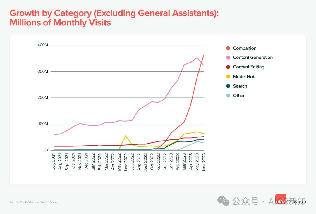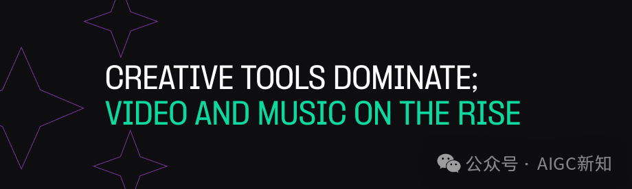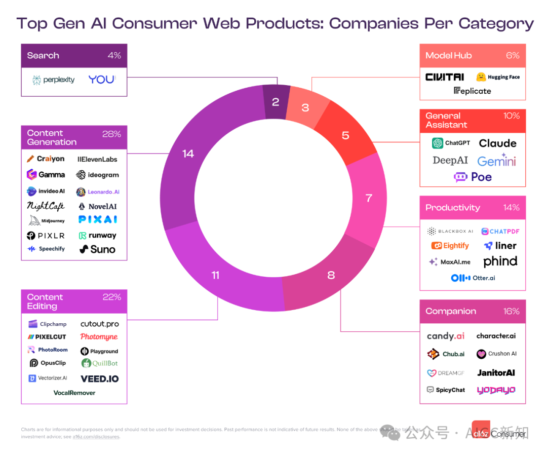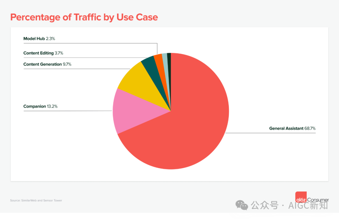 随着内容生成工具(创意性)的崛起,流量开始弥散,图像生成是主要用例,占 41% 的流量,其次是专业消费者写作工具(26%)和视频生成(8%)。