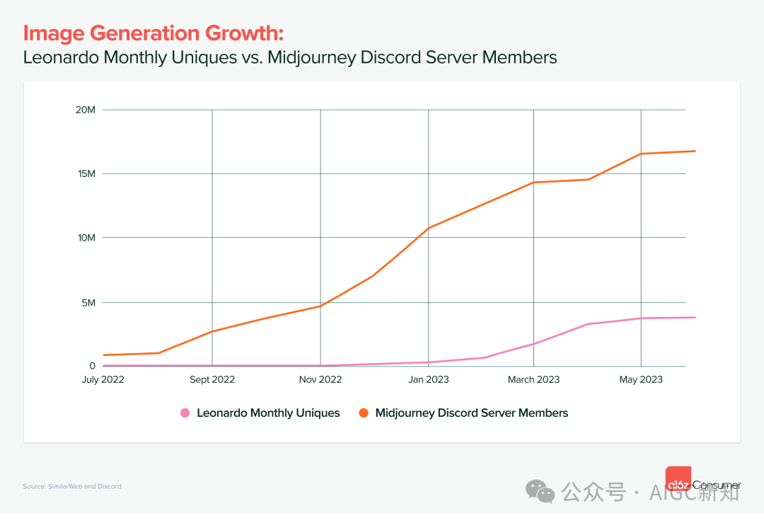 很多AI应用,如midjourney,搭建在discord服务器上,9 个 AI 产品或社区的邀请流量排名前 100 名 Discord 服务器,其中 Midjourney 位居榜首。