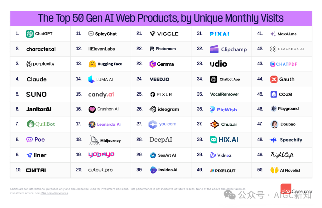 为了回答上述问题,a16z对 SimilarWeb 流量数据进行了统计(截至 2023 年 6 月),对每月访问量排名前 50 的 GenAI 网络产品进行了排名。