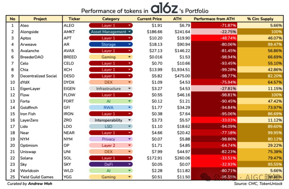 a16z投资组合中代币的表现如下: