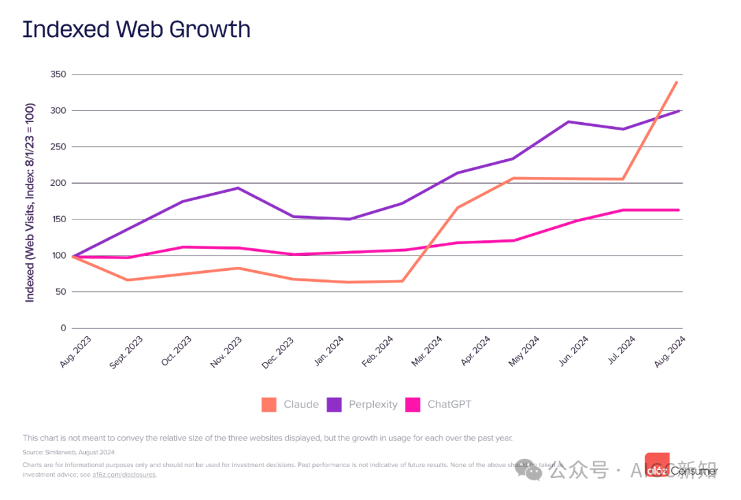 六个月后,根据 SimilarWeb(截至 2024 年 1 月),a16z再次对前 50 名 AI 优先 Web 产品进行排名。