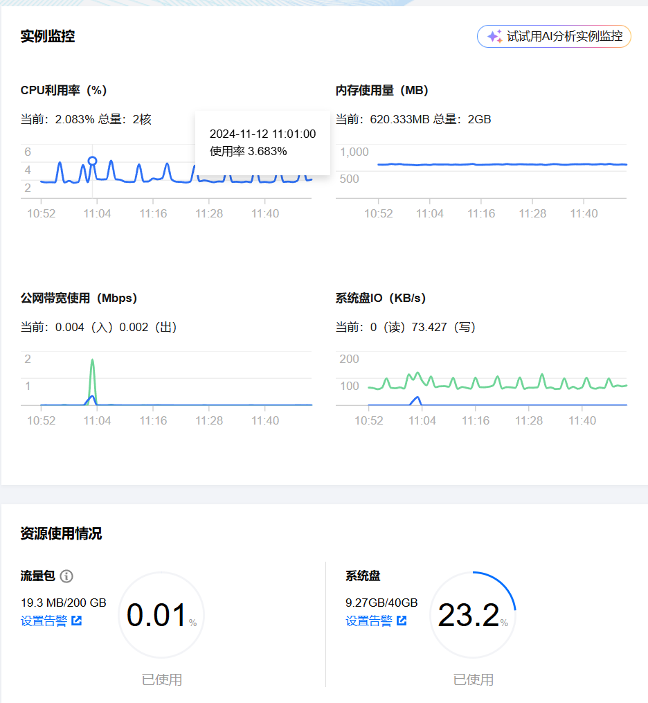 通过“实例监控”页面,用户可以实时查看实例的CPU、内存、网络流量等资源的使用情况,以确保服务器能够满足业务需求。