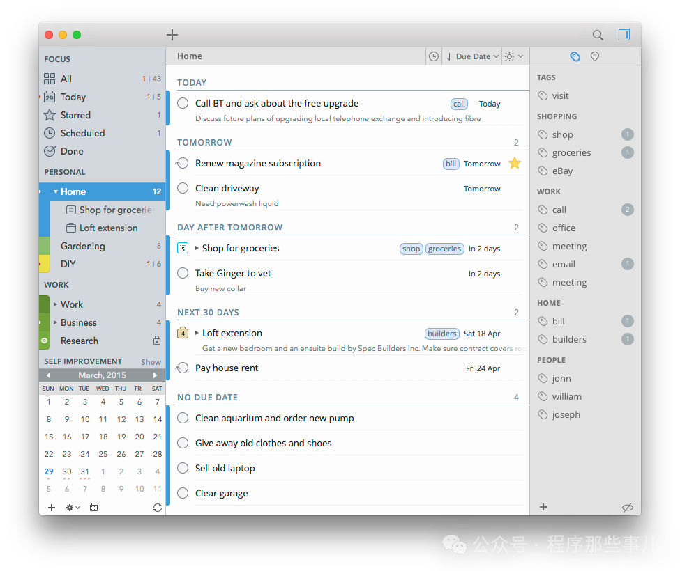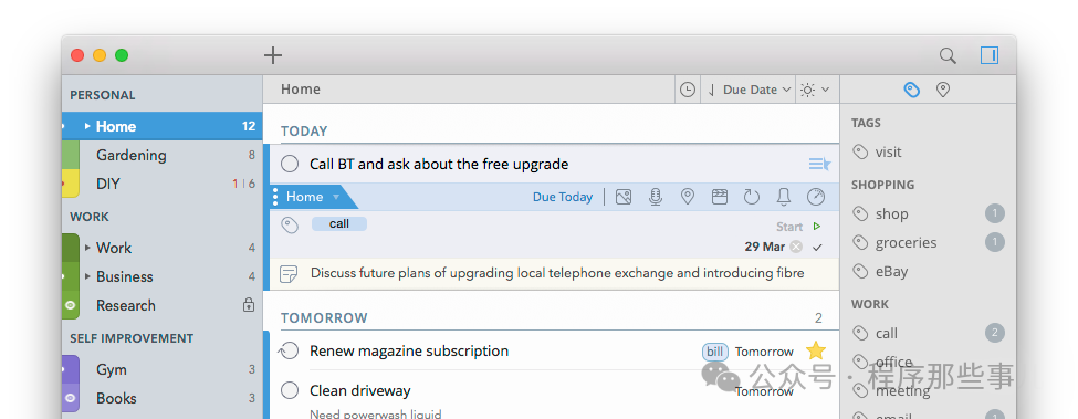 2Do 提供了丰富的功能集和易用性之间的完美平衡。从详尽的排序、聚焦、标签、位置和日期范围过滤器,2Do 在开发的每一个角落都体现了对细节的深思熟虑和关怀。
