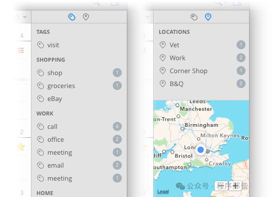 2Do 的实用面板集成了标签、“附近”功能,并且即将加入日历事件视图。用户可以一键切换到所需功能,或者完全隐藏面板,保持工作区的整洁。