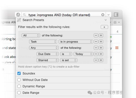 2Do 的高级搜索功能让用户能够构建复杂的查询,创建最智能的列表。支持逻辑运算符和嵌套查询,让搜索更加灵活和强大。
