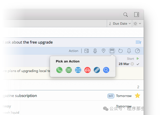 2Do 的“动作”功能让用户可以直接在应用内添加 URL、地址或 Google 搜索到任务中,甚至可以直接发送短信或拨打电话,极大地提高了任务处理的便捷性。