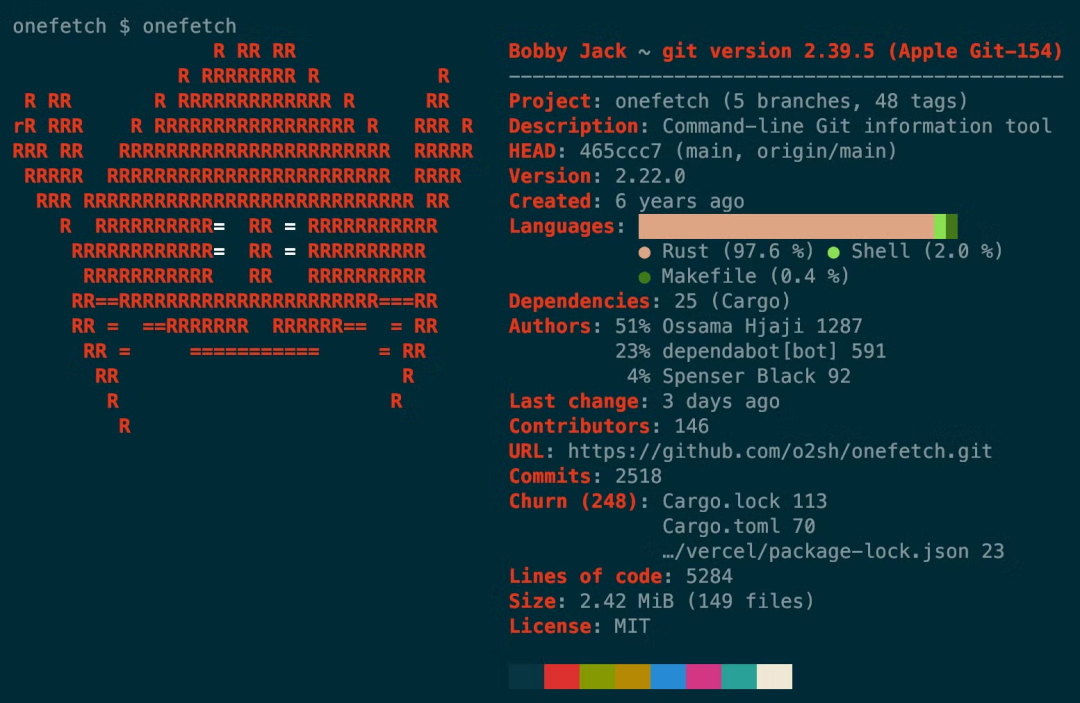Onefetch[1] 是一个项目摘要器,具有 ASCII 艺术、语言细分、贡献者信息和其他详细信息。下面是一个示例,显示 onefetch 针对自己的存储库运行:
