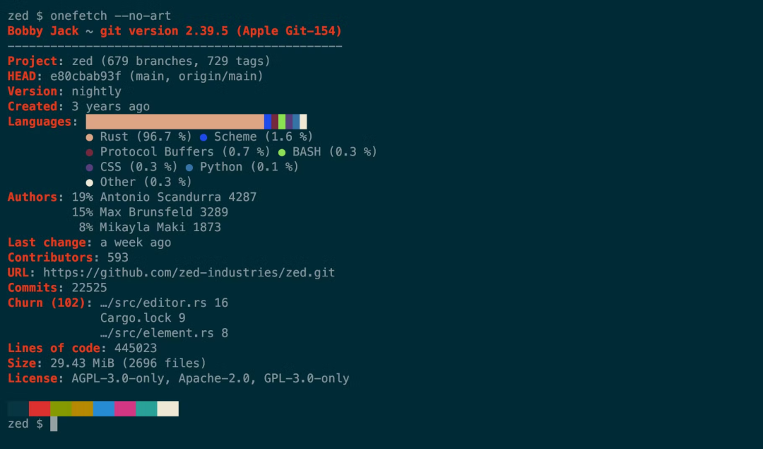💡 Onefetch 大量使用颜色编码输出,因此将其通过管道传输到其他命令或将其重定向到文件不会获得良好的结果。