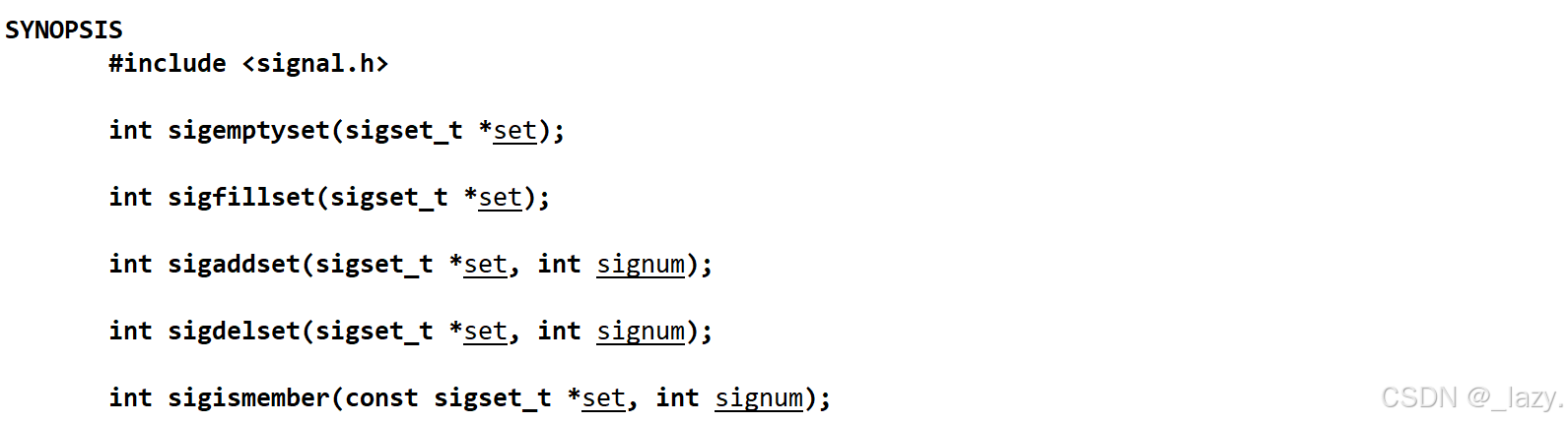 对于函数的调用,我们需要认识的是这5个函数,分别是sigemptyset, sigfillset, sigaddset, sigdelset,sigismember。
