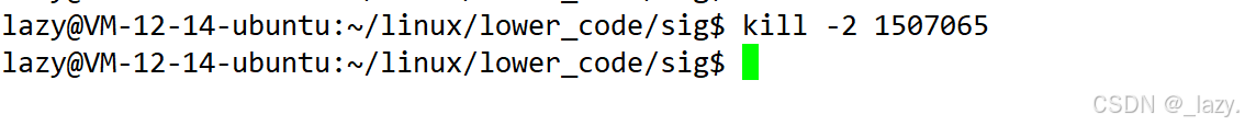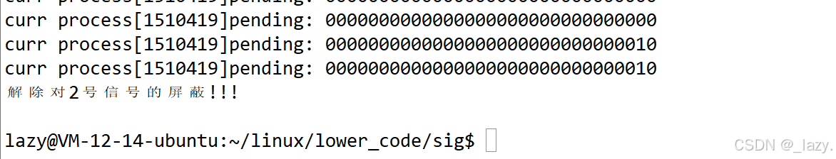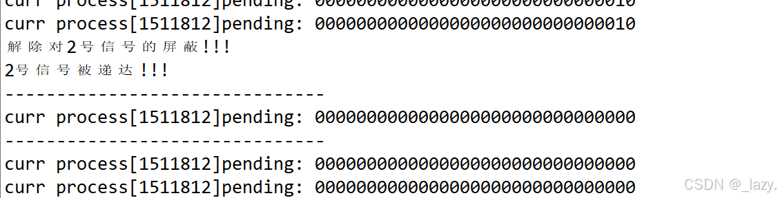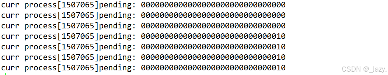 我们往1507065进程发送信号2,发现pending位图的第二个比特位变成了1,也就是它接收到了2号信号,所以变成了1。