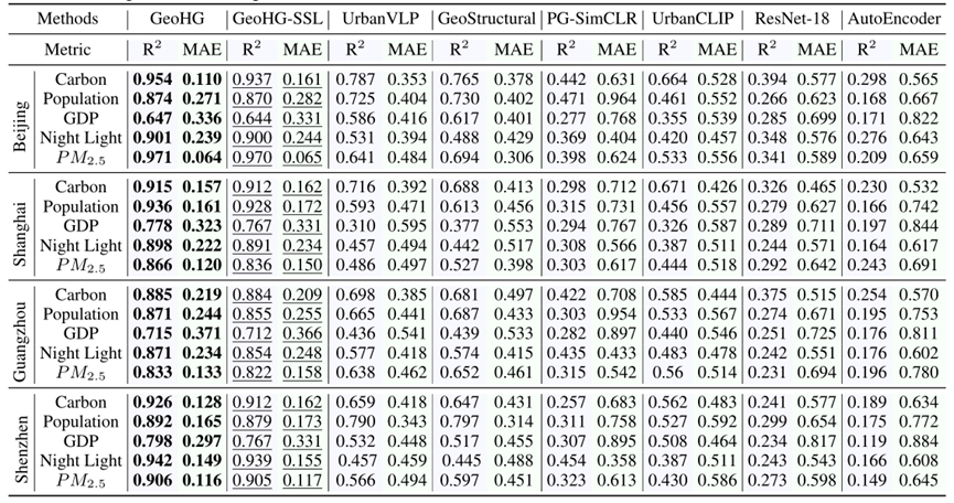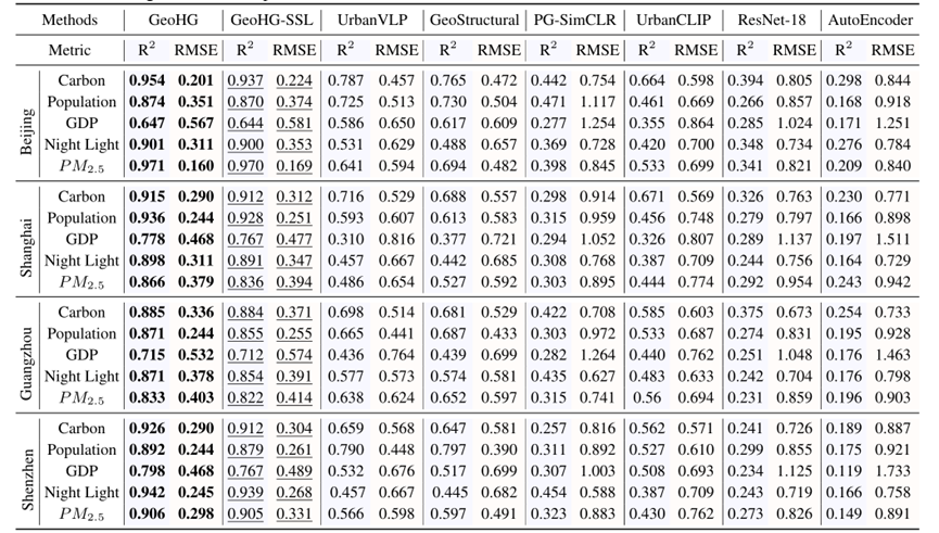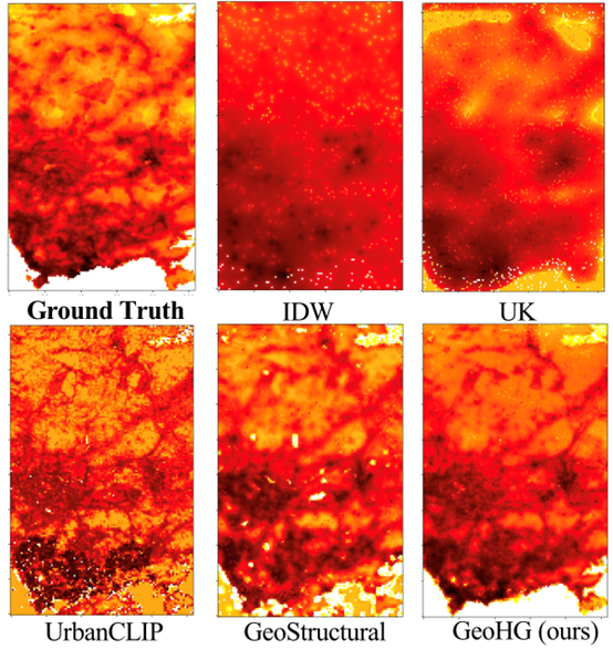 为了评估GeoHG方法的性能,研究者们与多个基线模型进行了比较。其中包括传统的地理空间插值方法,如反距离加权(Inverse Distance Weighting,IDW)和通用克里金(Universal Kriging,UK),基于深度学习的多源、多模态的地理空间表征方法(UrbanVLP,GeoStructural)以及其他一些基线模型,包括PG-SimCLR、UrbanCLIP、ResNet-18和AutoEncoder等。