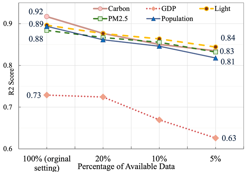 作者提出,全球范围内应用地理空间模型通常需要大量标记数据进行监督训练,这一过程耗时、计算成本高,并受到数据稀缺的限制。为了评估GeoHG在有限数据情况下的性能,研究者们使用了不同比例的可用训练样本,包括5%、10%和20%。实验结果显示,在仅使用5%数据的情况下,GeoHG在所有任务上的表现均优于之前的最佳方法。即使只利用20%的数据,GeoHG在人口、GDP、夜间光照、PM2.5和碳排放预测等任务上也只有轻微的性能下降。