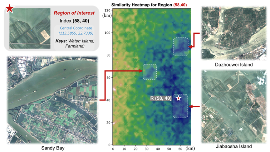 如图所示,研究者们发现对于区域(40,58),它是位于一个岛上靠近水域的农田区域。根据热力图显示,GeoHG自然地发现了同一岛上的其他区域,比如Jiabaosha Island,并且更接近的区域展示出更高的相似性。有趣的是,本文的模型找到了一些非常遥远但地理环境相似的岛屿,比如大洲尾岛和沙湾,它们具有相似的环境和社会功能。此外,广州市的西部主要是一个多山的工业区,在热力图显示出较低的相似性结果与这个地理事实完全一致。