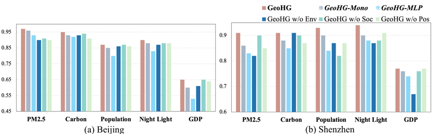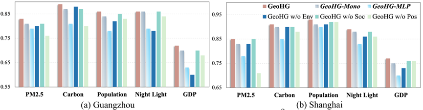 研究者们进行了消融实验(ablation study),以检验GeoHG方法中每个核心组件的有效性。他们提出了三个变体进行比较。第一个变体是“w/o Env”,即排除了卫星图像中的环境信息进行嵌入。第二个变体是“w/o Soc”,即省略了POI实体的嵌入。第三个变体是“w/o Pos”,即不利用区域的位置信息。同时,为了验证高阶关系表示的有效性,研究者们将GeoHG与两个变体进行比较。第一个变体是GeoHG-MLP,它丢弃了图结构,仅依靠区域内特征表示,并使用三层MLP进行回归。第二个变体是GeoHG-Mono,它保留了相邻区域之间的边缘关系,但丢弃了高阶关系的超边。通过四个城市进行五个任务的实验,研究者们得出了R2结果。