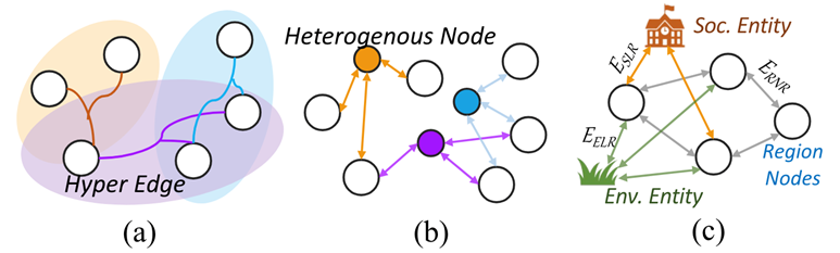 全面建模复杂的高阶区域关系:在地理空间中,区域之间的关系不仅限于二元邻接关系,还包括三元和更高阶的依赖关系。然而,现有的方法只能处理二阶关系,无法全面建模地理空间中的复杂高阶关系。为了解决这个问题,论文提出了一种新的地理空间异质图结构,名为GeoHG,它能够有效地捕捉和建模高阶区域关系。