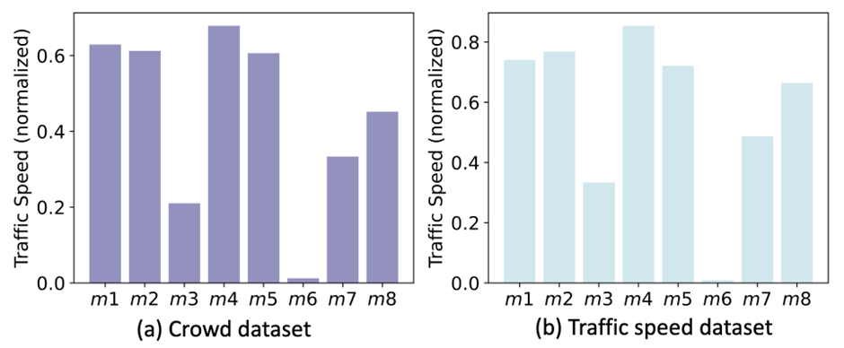 不同城市、不同地理空间、不同时间段的时空数据往往展现出显著的分布差异。此外,不同领域的数据,例如空气污染数据、交通数据、人流数据和网络基站数据,也存在显著的分布差异。这些差异增加了模型的复杂性,要求模型具备强大的泛化能力以适应各种数据分布。