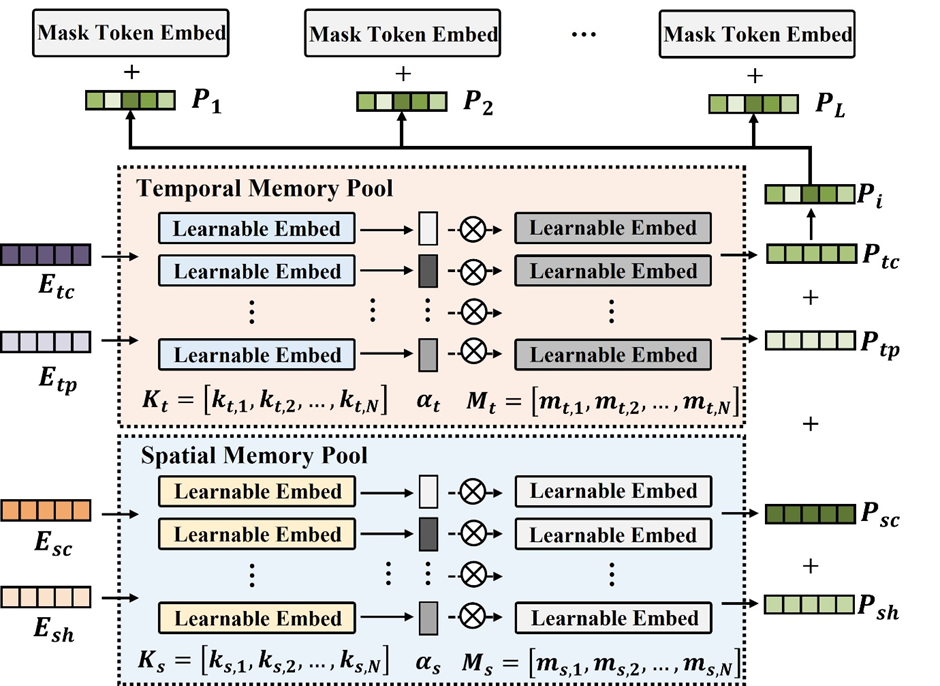 如下图所示,提示网络从记忆池中提取有用的提示,这些记忆池存储了优化后的时空领域知识。提示的生成过程利用时空特征表示作为查询,提取相应的记忆向量,这些提示向量再集成到Transformer架构的输入空间,提升模型的预测能力。