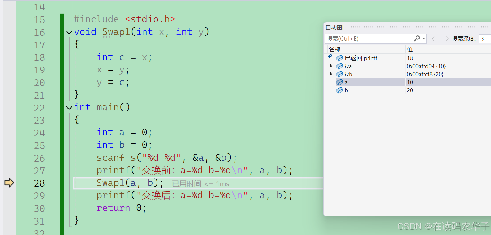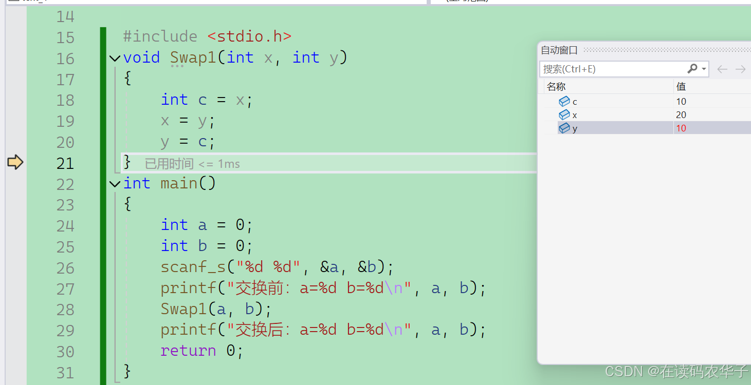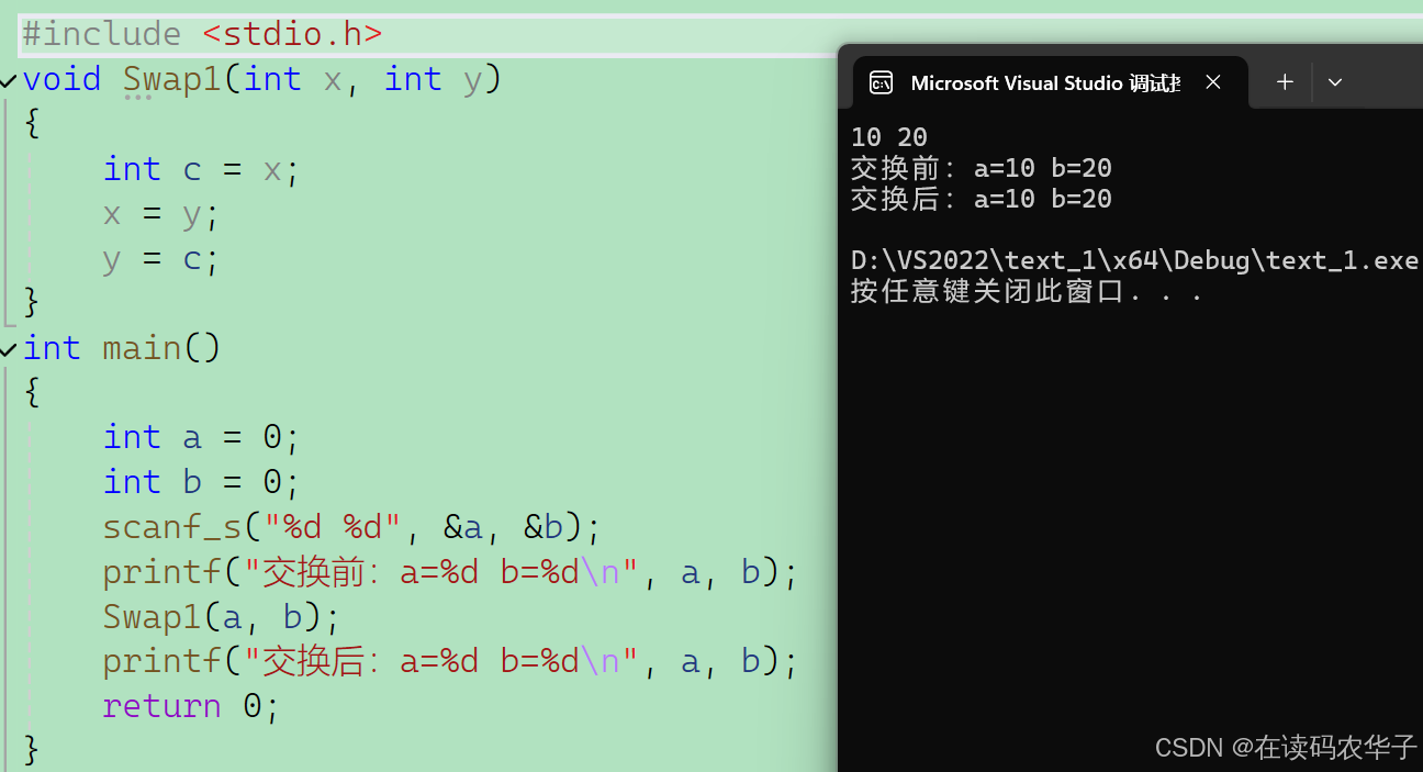 刚开始我们或许会简单的仿照我们常用的加和函数的写法来写一个交换函数,输入10和20如下: