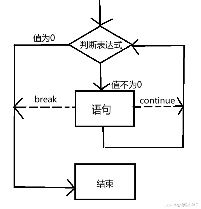 }首先上来就是执行判断表达式,表达式的值为0,循环直接结束;表达式的值不为0,则执行循环语 句,语句执行完后再继续判断,是否进行下⼀次判断