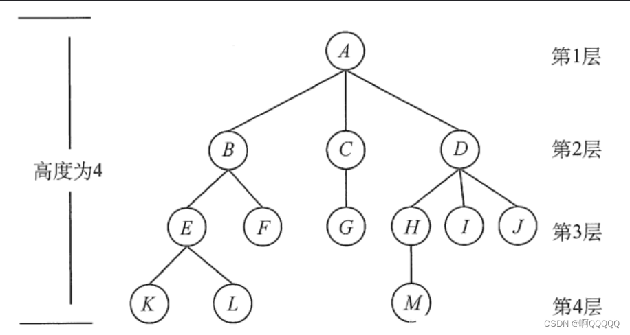 如图,是一棵树,凡是在下一层有分支的节点都叫做根节点,例如A是B/C/D的根节点,B是E/F的根节点,根节点也叫做父节点,父节点下面连接的那一行节点叫做孩子节点,同一层的节点称为兄弟节点,当一个节点的下面没有分支的时候,叫做叶子结点。树的节点在第几层,高度就是几,度数就是子节点的个数。