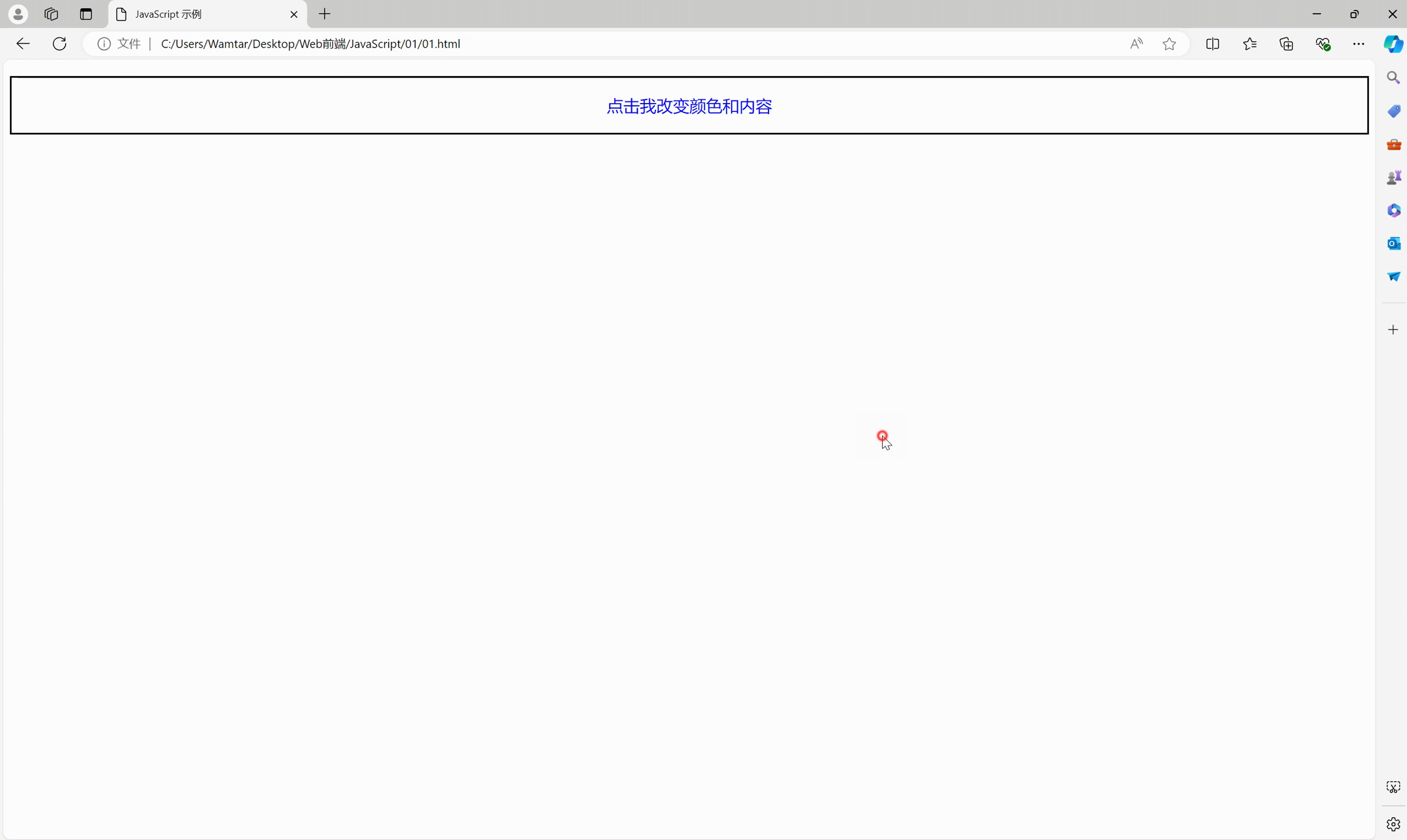 });当你点击页面中的这段文本时,它的颜色会从蓝色变为红色,且文本内容会更新为“你已经点击了这个文本!”,这就是 JavaScript 带来的动态效果。