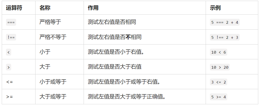 console.log(num); // 输出 1比较运算符用于比较两个值,并返回布尔值(true 或 false)。常见比较运算符包括: