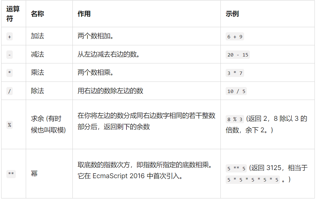 console.log(bigIntVar); // 输出:123456789012345678901234567890n算术运算符是 JavaScript 中用于执行数学运算的重要工具。常见的算术运算符包括:加法 +减法 -乘法 *除法 /取余 %