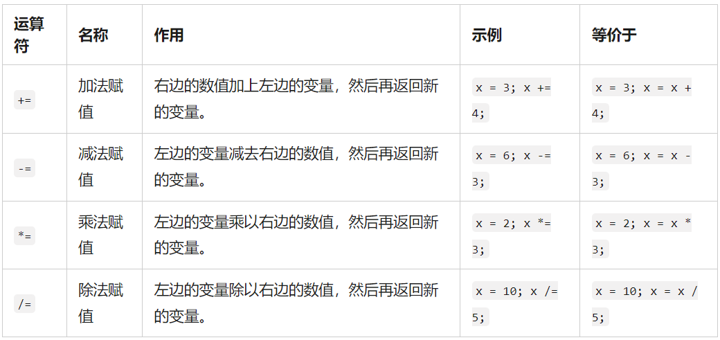 =:赋值、+=:加并赋值、-=:减并赋值、*=:乘并赋值、/=:除并赋值、%=:取余并赋值