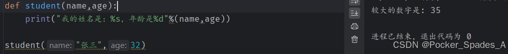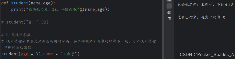 特点:使用关键字参数允许函数调用的时候,实参的顺序和形参的顺序不一致,可以使用关键字进行自动匹配.