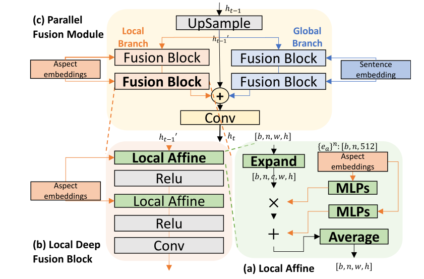 htht再经过两组MLP分别学习由局部语义调节的尺度和偏差,变为ht+1′ht+1′(论文图中错误标注成了t-1)首先扩展到正确的形状,然后缩放并偏置。条件特征被平均并传递给后续处理器。