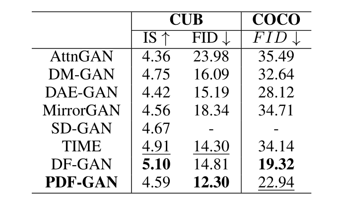 CUB和COCO上FID和IS的得分结果: