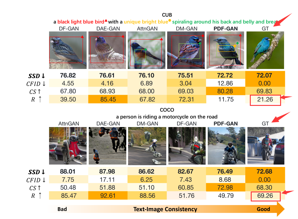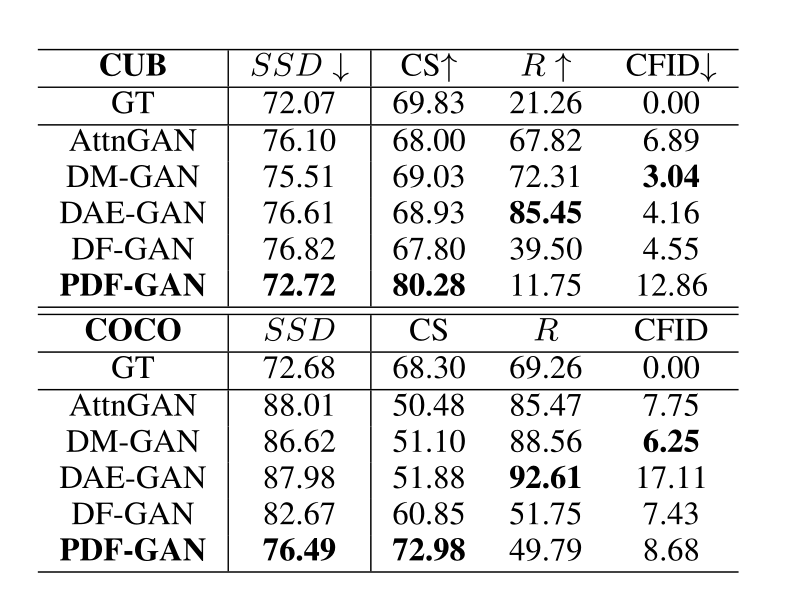 数据集:CUB、COCO 定量评估:专用评估指标有SSD(本文提出),R分数、CS,和CFID。标准评估指标(公认性更强)有Inception Score(IS)和 Fréchet Inception Distance(FID) ,IS未用于评估COCO,因为它对COCO的效果不好。所有度量都是在30K个生成的图像上计算的。