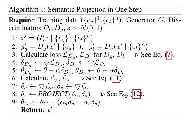 SProj:SProj用于缓解语义差距,通过约束语义优化方向来克服语义差距,从而增强文本图像一致性,SProj受GEM持续学习的启发将最小化La和Ls视为两项任务,不交替训练两项任务,而是同时优化它们。在每个步骤中,在我们计算了La和Ls的梯度δa和δs之后,在我们处理两个任务的反向传播之前,我们对δs进行PROJECT。如果存在方向冲突,语义优化方向δs将被重新投影到一个新的方向δs,在该方向δs中,它可以在不放大La的情况下优化Ls伪代码如下: