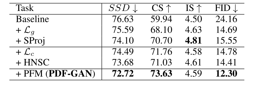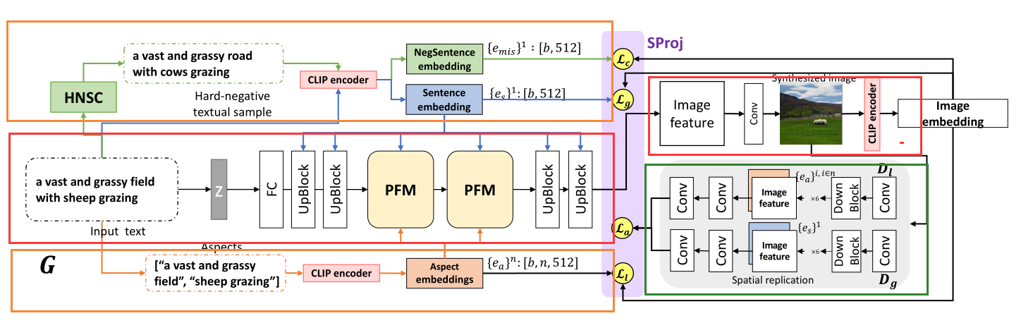 PDF-GAN通过使用并行融合模块(PFM)融合不同层次的语义信息。对于语义监督,采用了全局和局部鉴别器、语义感知损失和对比损失。为了更准确和稳健地捕获文本中的语义信息,HNSC创建了稳定和可控的硬否定样本,SProj可以通过约束语义优化方向来克服语义差距。