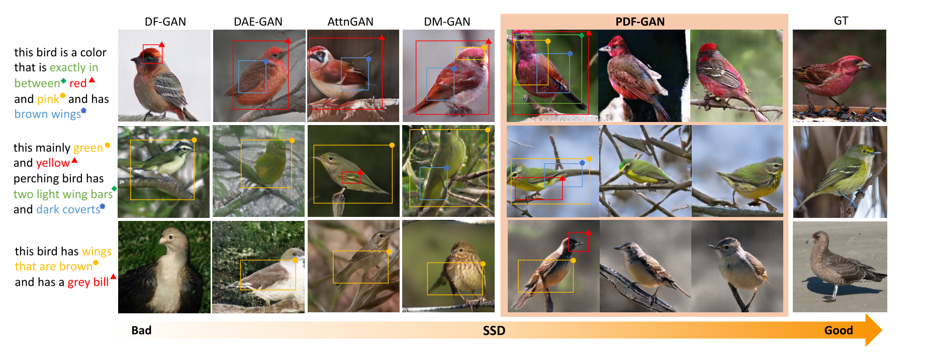 在CUB上通过AttnGAN、DM-GAN、DAE-GAN、DF-GAN和PDF-GAN的合成实例: