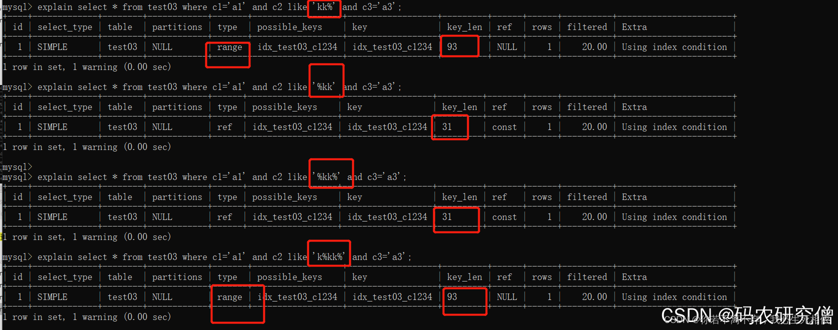 explain select * from test03 where c1='a1' and c2='a2' and c4='a4' order by c3;explain select * from test03 where c1='a1' and c2='a2' order by c3;