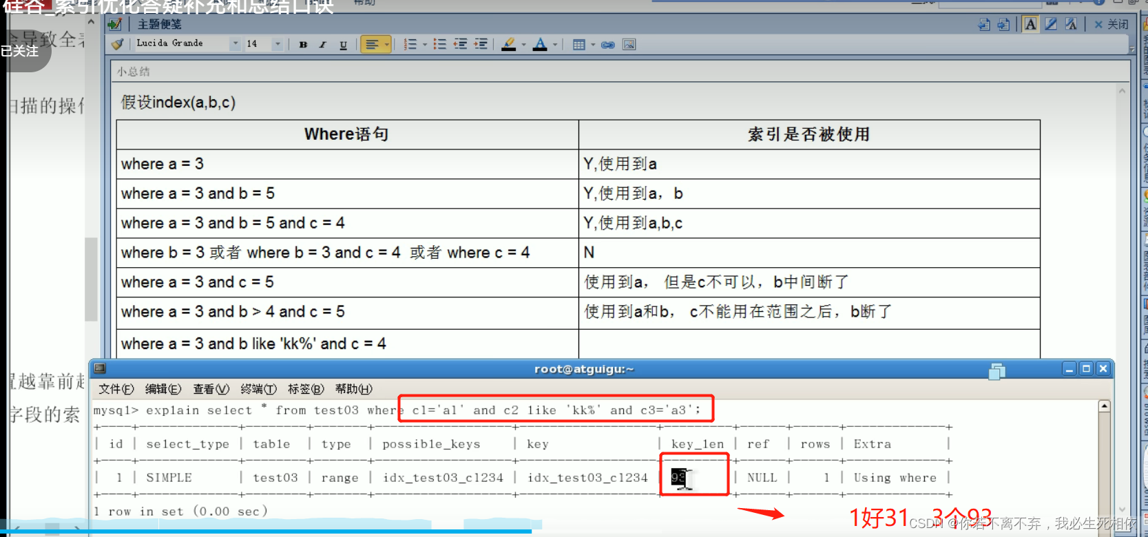 where a= 3 and b like ‘k%kk%’ and c = 4 | Y,使用到a,b,c |
