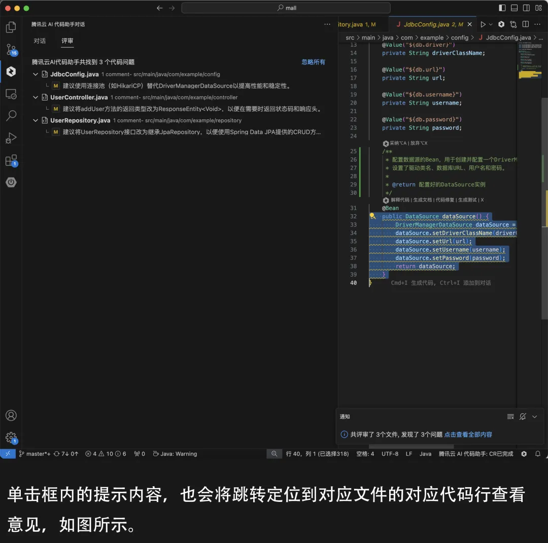 注意:评审执行中,会根据 # 选择的范围大小,会在对话框中有不同的评审过程的交互。在底部条有一个进行状态,当 #diff 的数量较多的时候,可能会有等待时间。你也可以继续当前工作,直到评审出结果后返回到 AI 代码助手对话中查看结果。