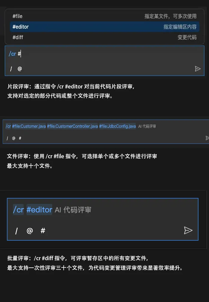 AICR 的 AI 辅助自评审功能分为片段评审、文件评审 和 批量评审,开发人员可以通过简单的指令 /cr# 触发不同的评审模式, 并进行代码审查