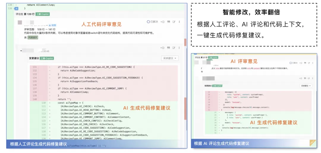 在源代码托管平台 Web 端,CR 模型基于人工评论、代码上下文、一键生成 AI 代码修复建议。