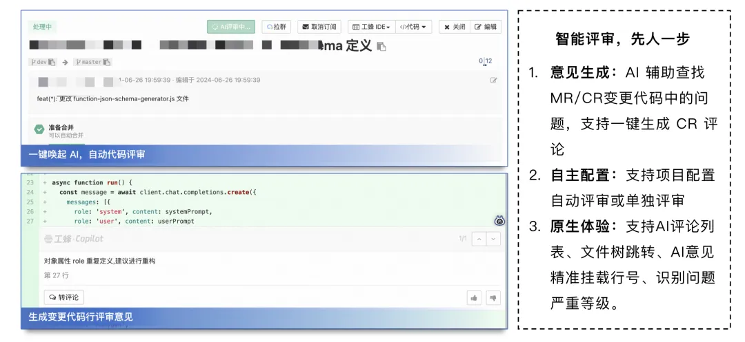 结合大模型技术,将人工评审转为采用智能代码评审(AI Code Review,以下简称AICR),如图3,通过 AICR 辅助评审,开发人员可快速识别和修复代码中的潜在代码质量问题,同时生成规范的合流 MR 摘要信息,为源代码管理和协作流程带来更高效的体验。