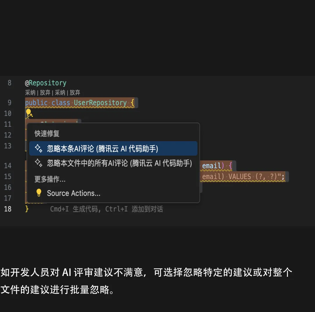 智能评审(AICR,AI Code Review)是腾讯云 AI 代码助手的一项功能,腾讯在 AICR 分 IDE 和代码仓库两种终端落地场景,其中在仓库端以腾讯源代码管理平台为例。