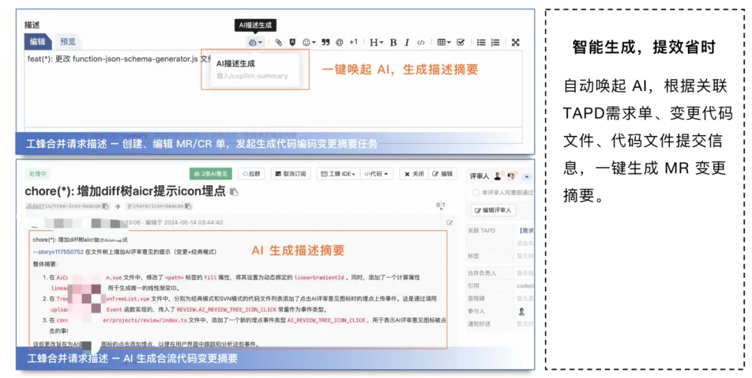 将源代码托管平台 Web 与腾讯 TAPD 需求单/问题单、变更文件、提交信息关联,一键生成 MR 合流代码变更摘要,让评审者快速理解变更内容。