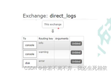 上一节中的我们的日志系统将所有消息广播给所有消费者,对此我们想做一些改变,例如我们希望将日志消息写入磁盘的程序仅接收严重错误(errros),而不存储哪些警告(warning)或信息(info)日志消息避免浪费磁盘空间。Fanout 这种交换类型并不能给我们带来很大的灵活性-它只能进行无意识的广播,在这里我们将使用 direct 这种类型来进行替换,这种类型的工作方式是,消息只去到它绑定的 routingKey 队列中去。