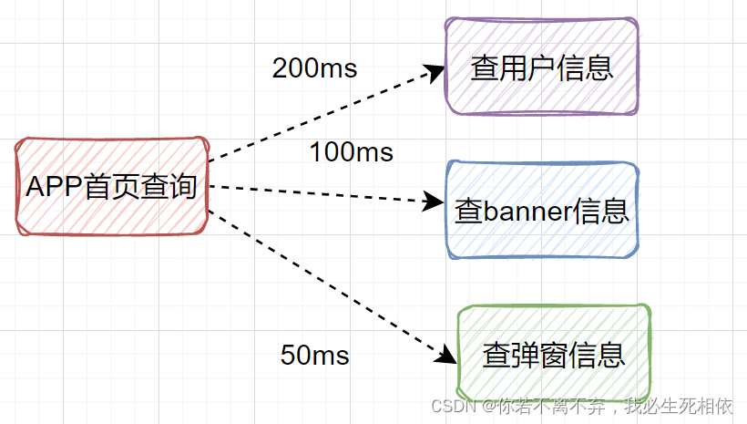 比如,我们设计一个APP首页的接口,它需要查用户信息、需要查banner信息、需要查弹窗信息等等。假设耗时如下: